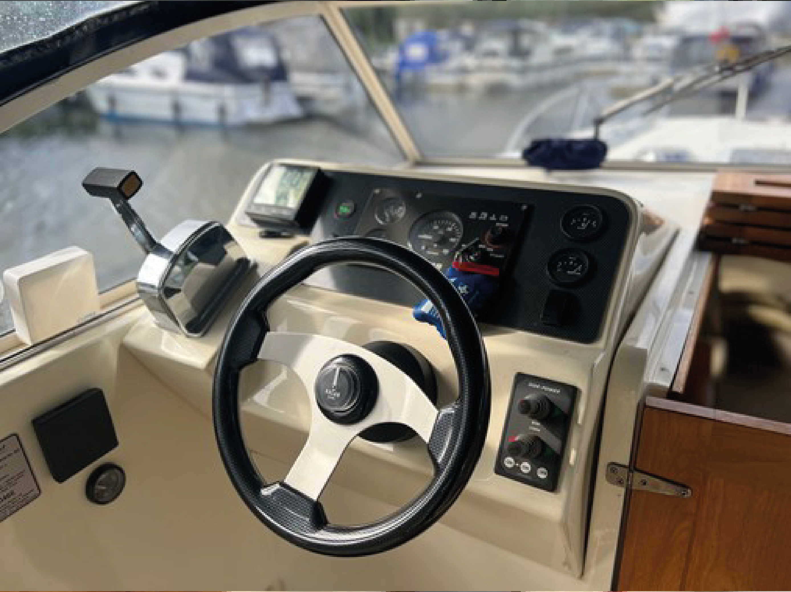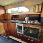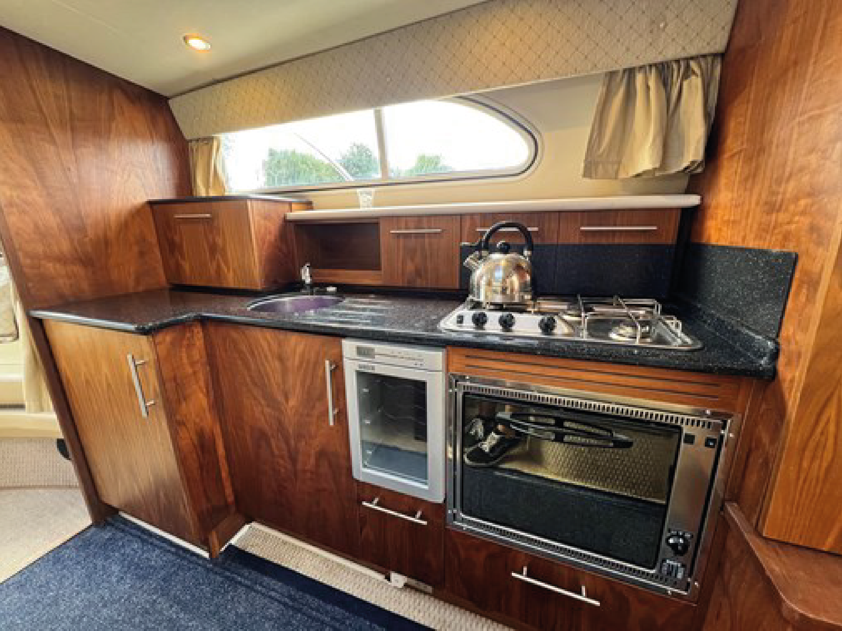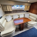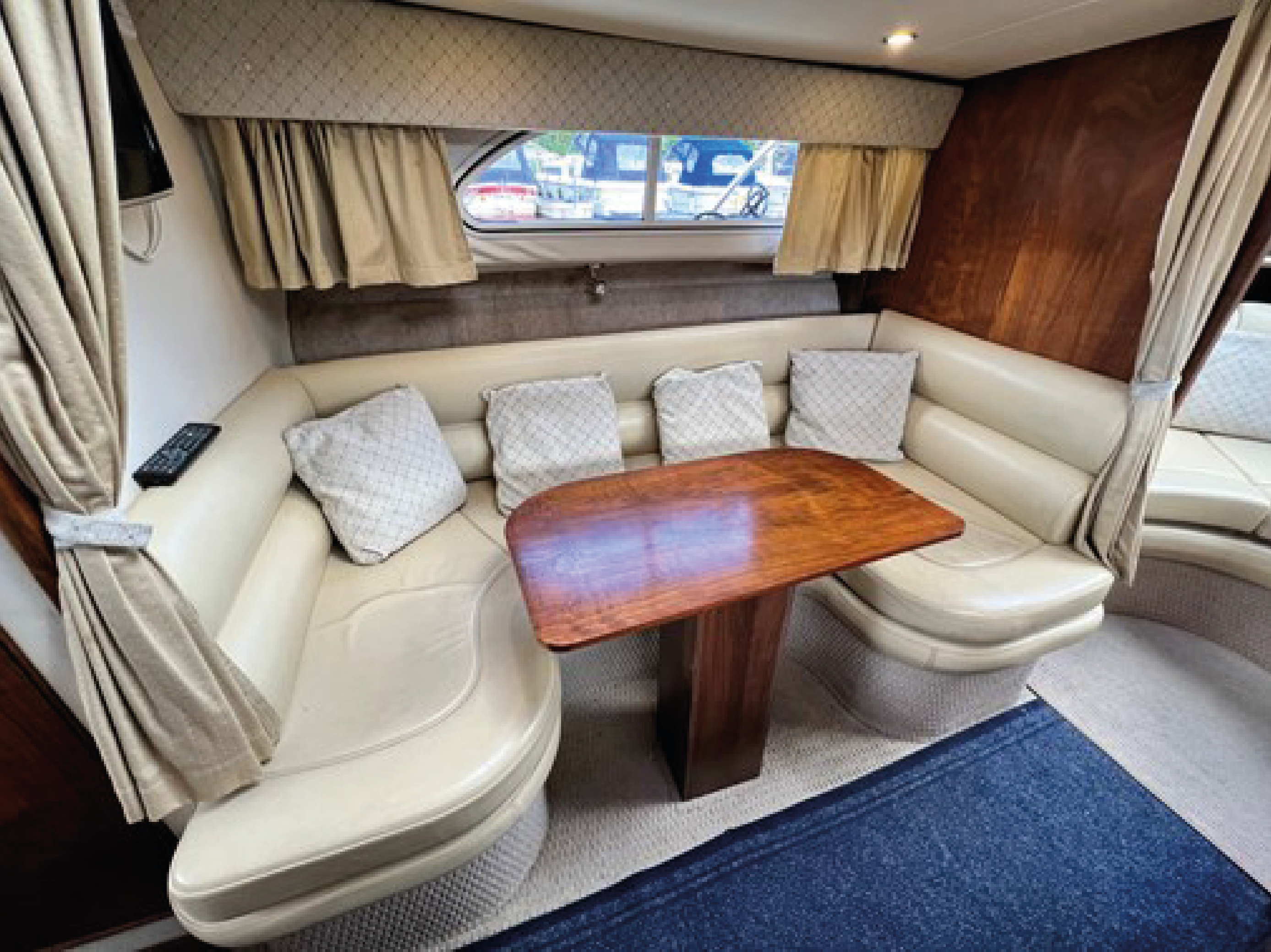 The interior was custom-built for the original owner, with no expense spared. Finished in American Black Walnut, the beautifully crafted interior layout includes a separate forward cabin, enhancing privacy and comfort.